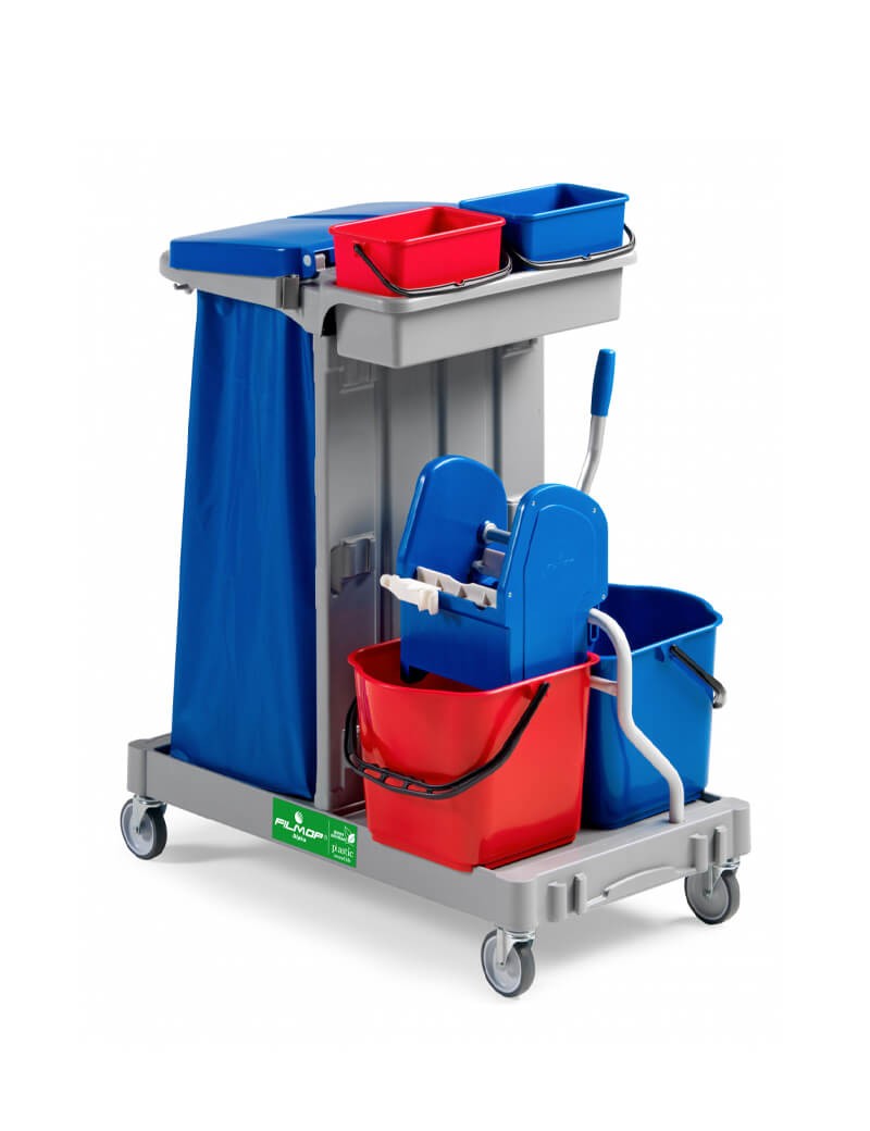Ideale per ambienti che richiedono lo spolvero, la raccolta rifiuti e il lavaggio dei pavimenti e delle superfici tutto in un carrello.