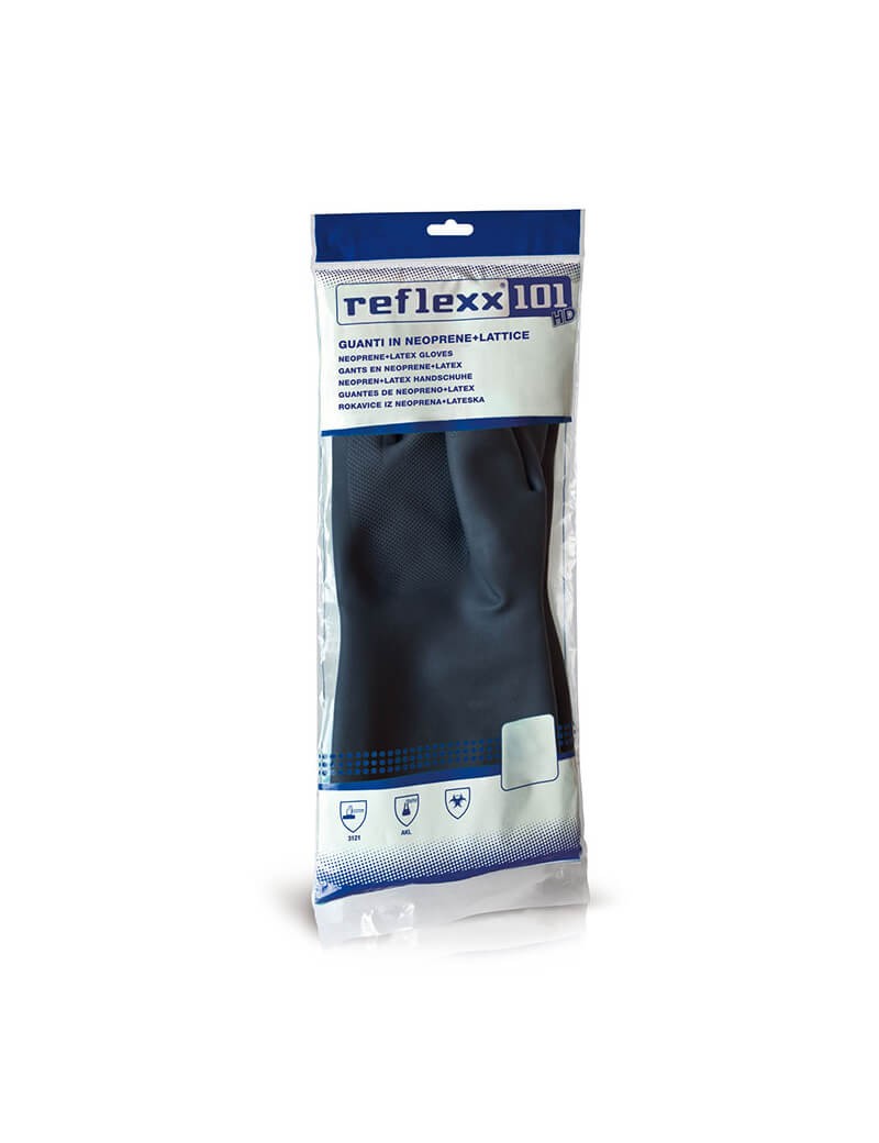 Guanti in lattice+neoprene con leggera felpatura interna. Clorinati esternamente. Zigrinatura antiscivolo. Buona resistenza chimica e meccanica polivalente.